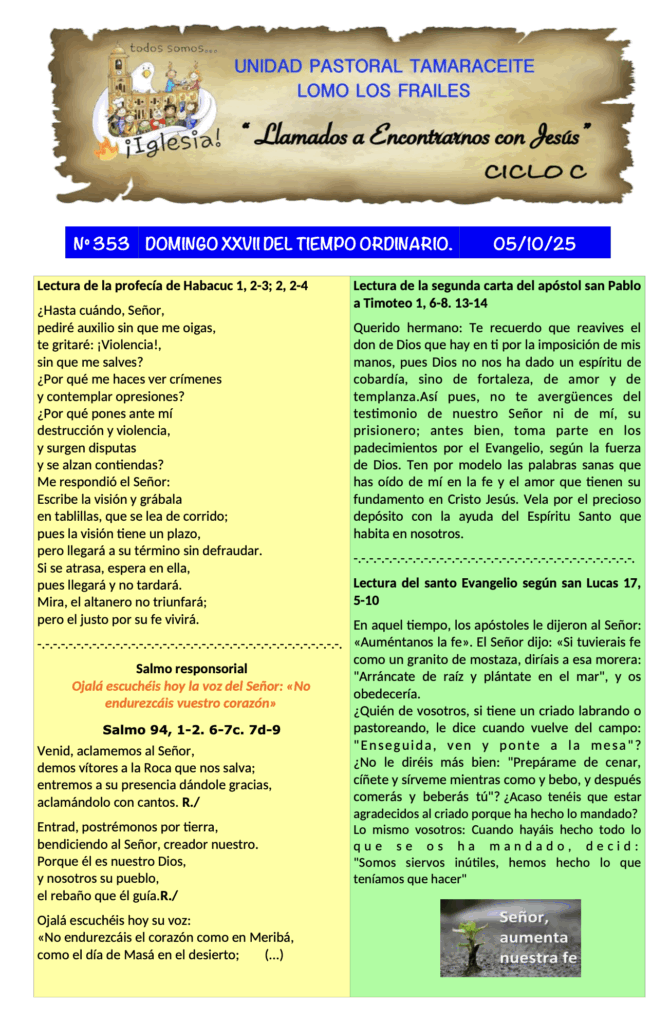 Hoy la Palabra de Dios nos anima a unirnos en oración con los discípulos y pedirle al Señor que aumente nuestra fe. El tema central de las lecturas de este domingo es la fe. En el libro de Habacuc se habla de ella como fidelidad que da vida y que ayuda a comprender la misión del profeta. Para el autor de la segunda carta a Timoteo, la fe es, junto con el amor, la fuerza que hace posible el anuncio de la Buena Noticia. Y Jesús, en el pasaje del evangelio, tras animar a los discípulos a alcanzar una fe verdadera, la propone como fundamento del servicio cristiano.