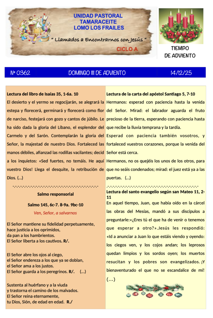 Celebramos el tercer domingo de Adviento, llamado, desde hace algunos siglos, «Domingo de Gaudete» o de «alegría». En este tiempo de adviento, los cristianos actualizamos la esperanza en la primera venida del Mesías, vivida por el antiguo Israel, y celebramos la esperanza del nuevo pueblo de Dios en en su segunda venida, al final de los tiempos. Hoy nos llena de alegría saber que estamos ya muy cerca de celebrar el nacimiento de Jesús. El menaje profético de las lecturas de hoy nos invitan a la esperanza y la alegría.